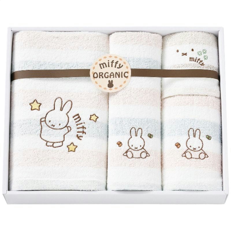 シンプルなボーダーにミッフィーの刺繍がアクセントのタオルセットです。