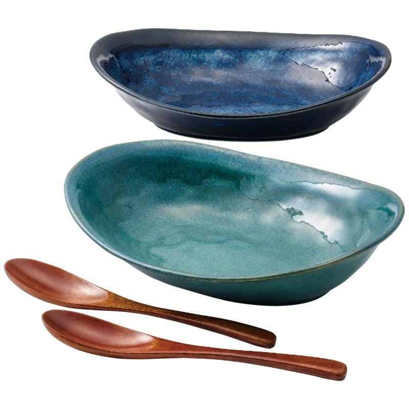 現品・内容・サイズ・材質: 18.5×24×6cmカレー鉢2客・磁器・全長19.5cmスプーン2本・天然木・[日本製]・スプーン[中国製]