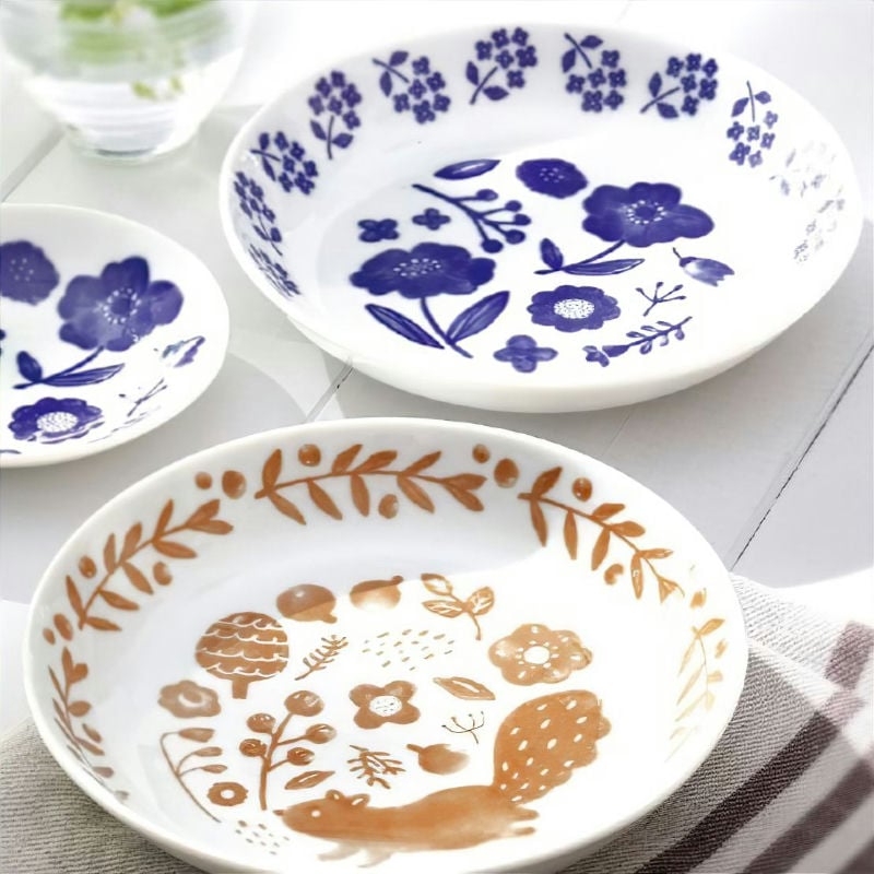 可憐に咲く花や元気に走り回るリスをイメージした可愛らしいデザインのパスタプレートセットです。