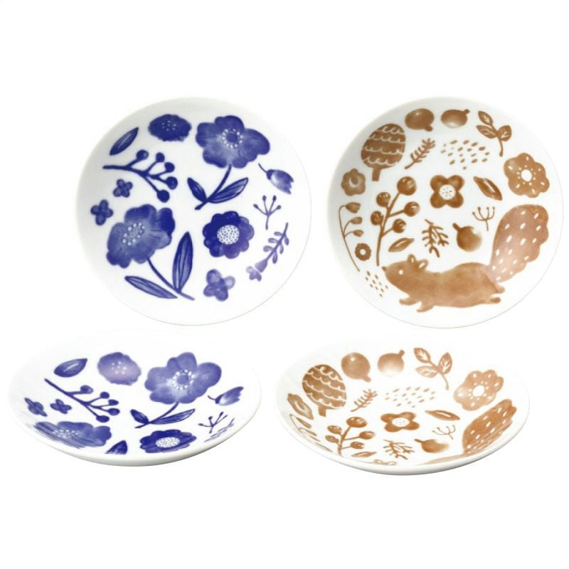 可憐に咲く花や元気に走り回るリスをイメージした可愛らしいデザインのプチプレート4個セットです。