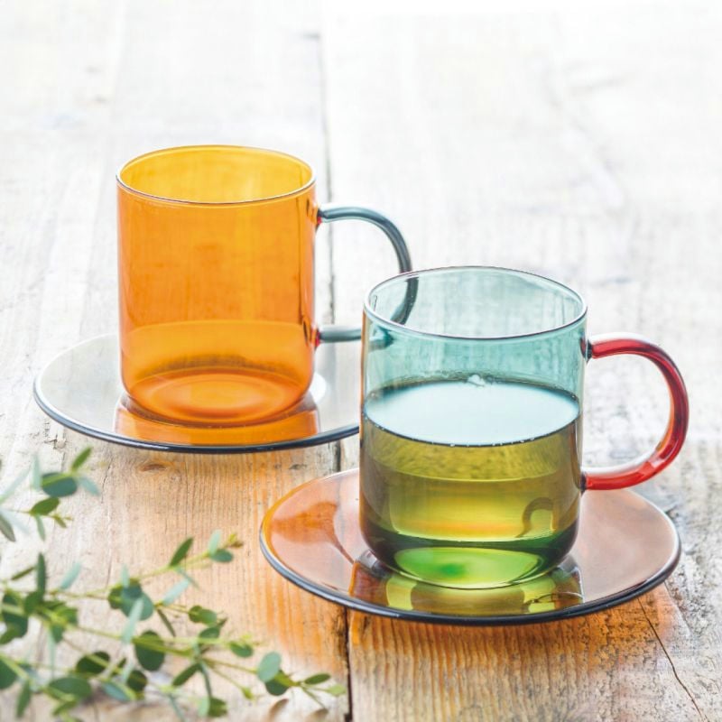 耐熱ガラス製でバイカラーの色合いが美しいマグカップとソーサーのセットです。シンプルな形状やサイズ感。一年中使っても空きが来ないデザインです。レトロな雰囲気でコーヒータイムを彩ります。