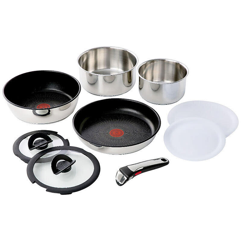 現品・内容・サイズ・材質: 直径26cmフライパン・直径20cm、直径16cmソースパン・直径24cmソテーパン各1個・本体:ステンレス鋼・底部:ステンレス鋼+アルミニウム+ステンレス鋼・20cm、16cmバタフライガラス蓋各1個・強化ガラス、シリコーンゴム・20cm、16cmシールリッド各1個・ポリエチレン・専用取っ手1個・フェノール樹脂