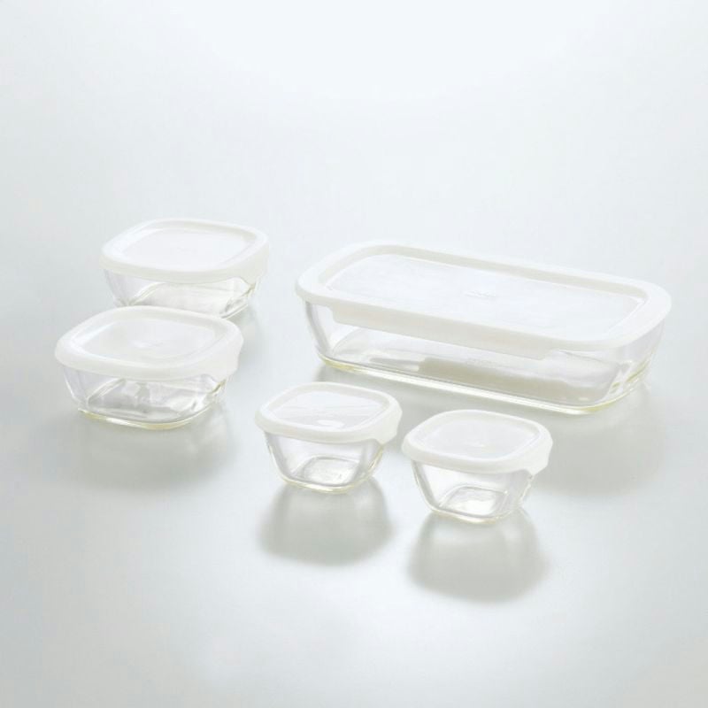 現品・内容・サイズ・材質: 23.8×12.5×5.6cm容量900ml保存容器1個・11.1×10.7×4.7cm容量250ml保存容器・8.3×8.1×4.6cm容量110ml角小鉢各2個・本体:耐熱ガラス・フタ:ポリプロピレン・[日本製]
