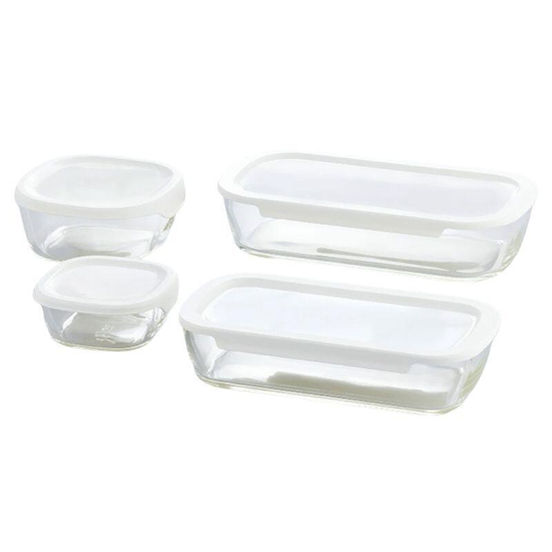 現品・内容・サイズ・材質: 27×14.5×6.2cm容量1.4l保存容器・23.8×12.5×5.6cm容量900ml保存容器・14.3×13.9×6.2cm容量600ml保存容器・11.1×10.7×4.7cm容量250ml保存容器各1個・本体:耐熱ガラス・フタ:ポリプロピレン