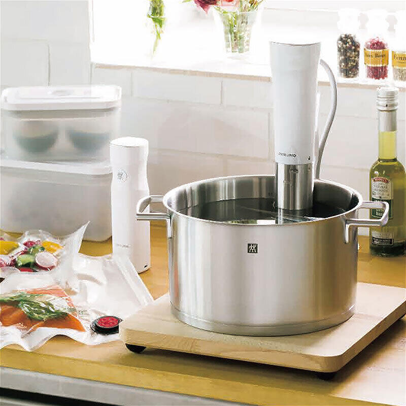 温度と時間をコントロールし、食材に合わせた絶妙な火入れを可能にする低温調理が加わりました。直感的に操作できるLED画面で、お好みの温度と時間を簡単に設定。お鍋の水を温め、加熱中はスティックに任せだけで手間いらず。火入れにテクニックが必要な大きな食材も失敗なく、高級レストランのような仕上がりを実現します。また、サラダチキンや煮物、シチューなどの身近な料理も、低温調理器を使うとグレードアップ、より美味しく。料理研究家川上文代さんの20レシピブック付。