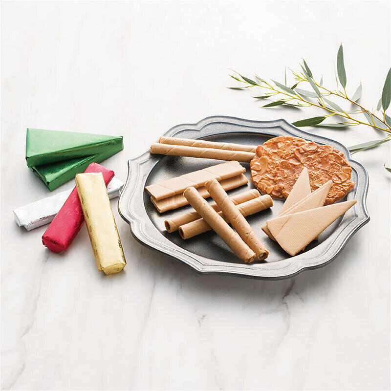 現品・内容・サイズ・材質: エコルセ三角8包(24枚)・短冊8包(16枚)・丸型(ミルクチョコ・ホワイトチョコ)各4包(各8本)・マンデルチーゲル16枚・モンロワ(アーモンド10包(20本)・ヘーゼルナッツ5包(10本))