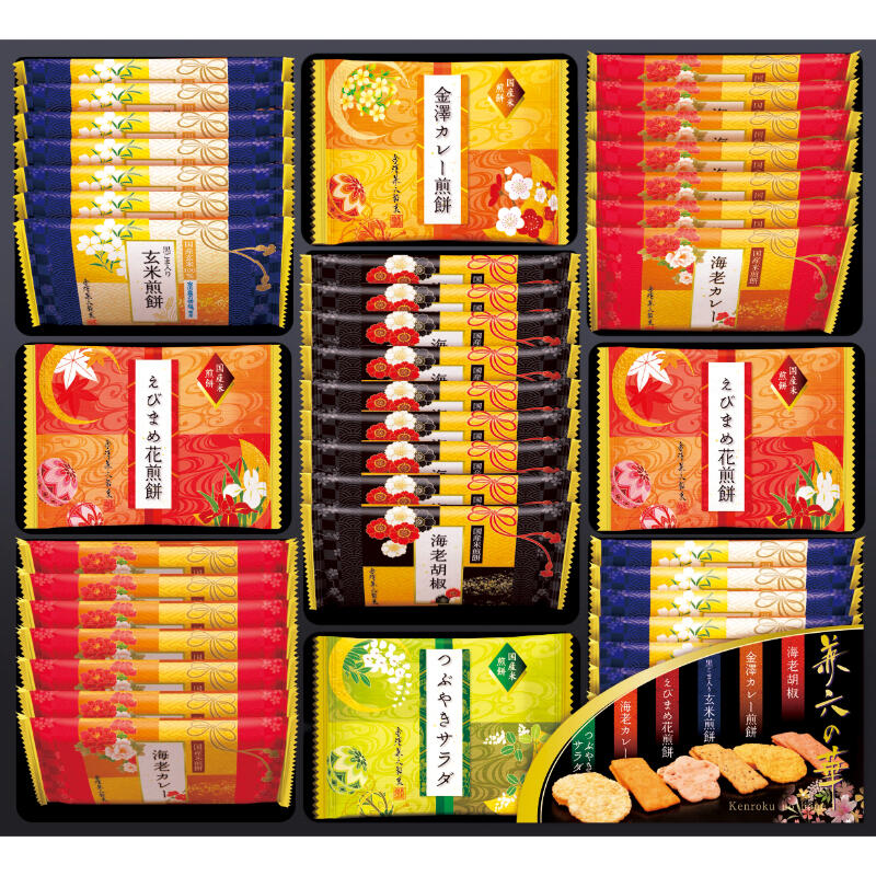 【商品内容】煎餅(黒ごま入り玄米×14・海老カレー×14・えびまめ花×10・海老胡椒×9・金澤カレー×5・つぶやきサラダ×5)