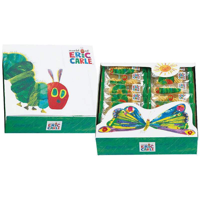 絵本「はらぺこあおむし」をモチーフにしたひねり揚げのギフトです、パッケージが絵本のページをめくるようです。