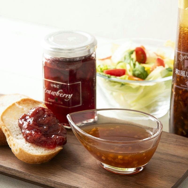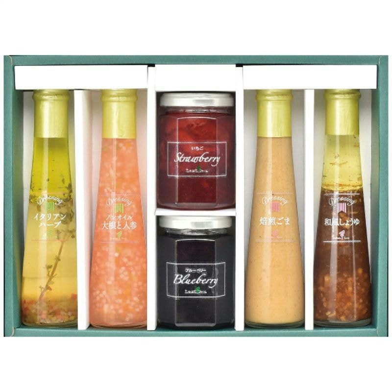 現品・内容・サイズ・材質: ジャム145g(いちご・ブルーベリー各1個)・ドレッシング122ml(イタリアンハーブ・ノンオイル大根と人参・焙煎ごま・和風しょうゆ各1本)