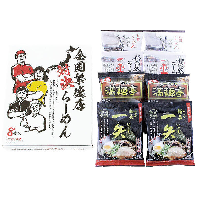 現品・内容・サイズ・材質: ラーメン(札幌いちまる味噌味・喜多方一平醤油味・広島満麺亭担々麺・博多一矢とんこつ味)各2食