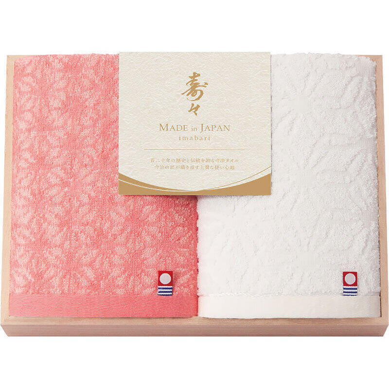 晴れの日を彩る紅白の色彩に成長を願う麻の葉模様を織り上げた、格調高い木箱入りの今治タオル。
