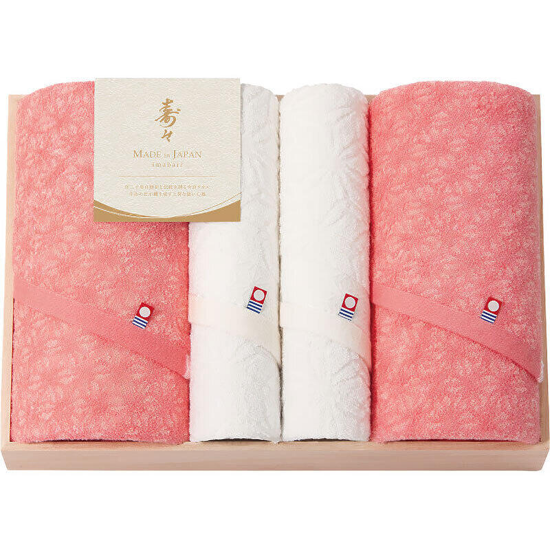 晴れの日を彩る紅白の色彩に成長を願う麻の葉模様を織り上げた、格調高い木箱入りの今治タオル。