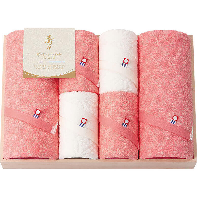 晴れの日を彩る紅白の色彩に成長を願う麻の葉模様を織り上げた、格調高い木箱入りの今治タオル。