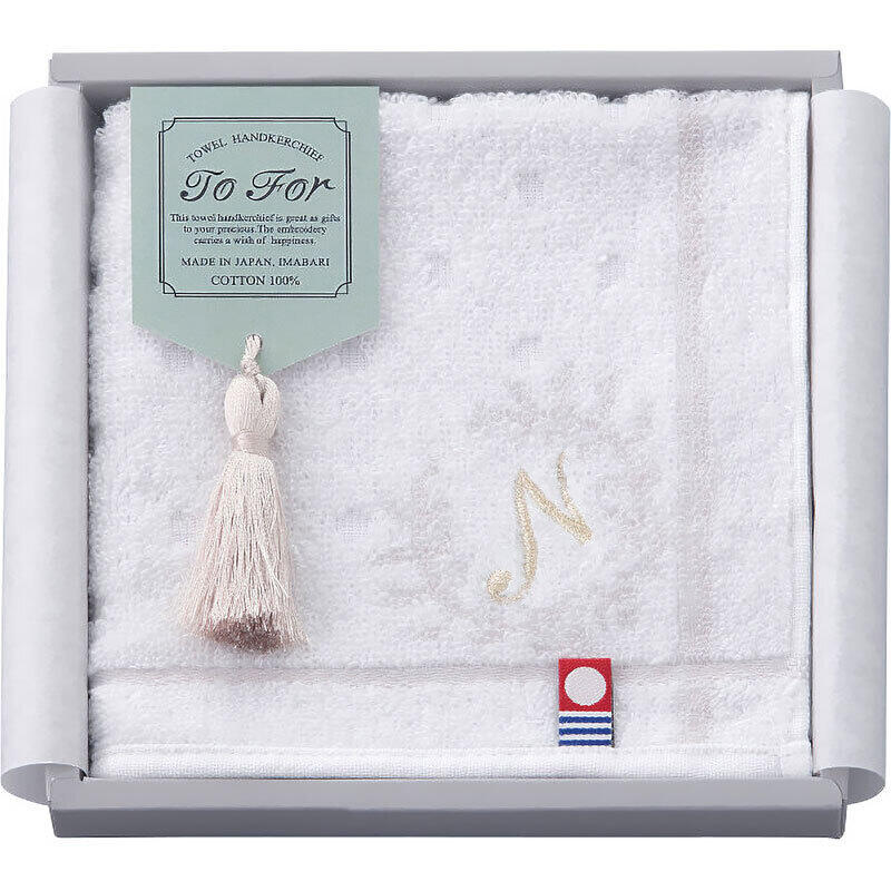 上品な光沢のイニシャル刺繍がポイントに入った今治産タオルハンカチ。