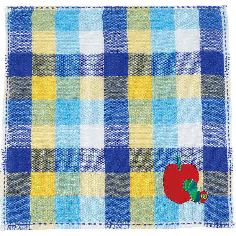 はらぺこあおむしのタオルハンカチ。はらぺこあおむしの世界を楽しめるアップリケ刺繍が特徴。表ガーゼ、裏無撚糸パイル仕様で柔らかくボリュームもあり、使い心地の良いタオルハンカチ