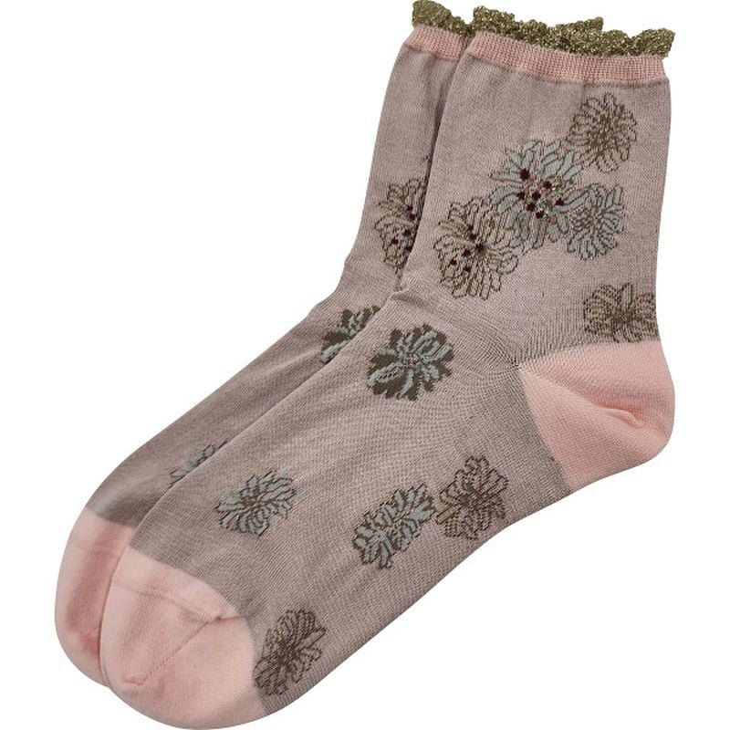 優しいカラーリングに履き口のラメ切替えのレースがエレガントなデザイン。