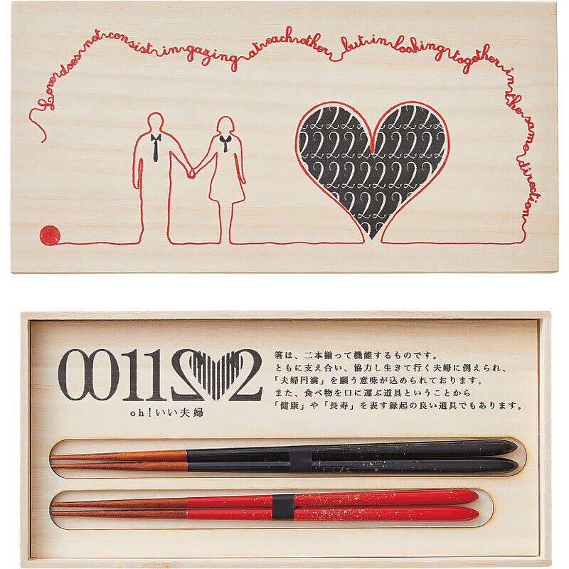 お箸は2本揃って1膳になり、機能を果たします。そんなお箸は二人三脚で歩む夫婦に例えられ、円満祈願としてギフトにも最適です。赤い糸が転がって夫婦とハートを作り出しているデザインを桐箱にしました。