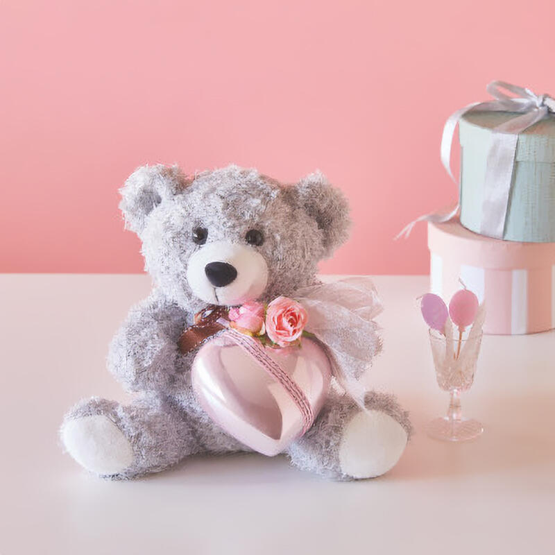 ブーケを抱いたもこもこかわいいクマのぬいぐるみ。可憐なアーティフィシャルフラワーとともに。やさしい気持ちと笑顔もプレゼント。