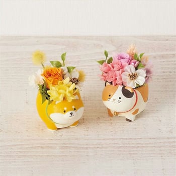 華やかなプリザーブドフラワーを手のひらサイズの可愛らしいアニマルポットに合わせました。アニマルの表情にほっこりします。