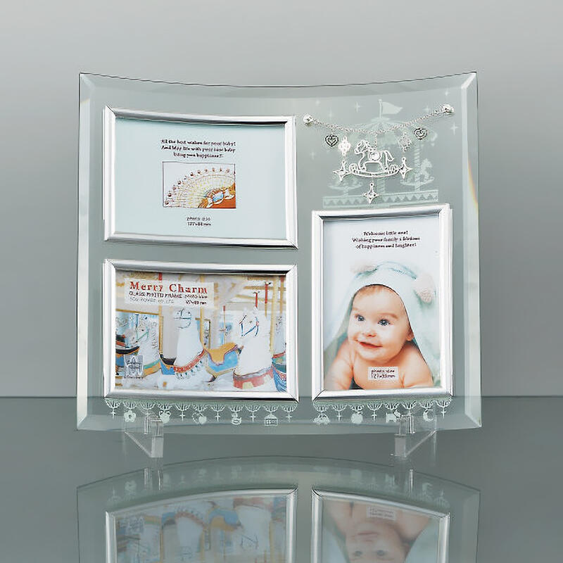 ■透明のガラスにベビーモチーフをプリントし、可愛いメリーチャームを付けました。ベビーギフトにお使い頂けるフォトフレームです。