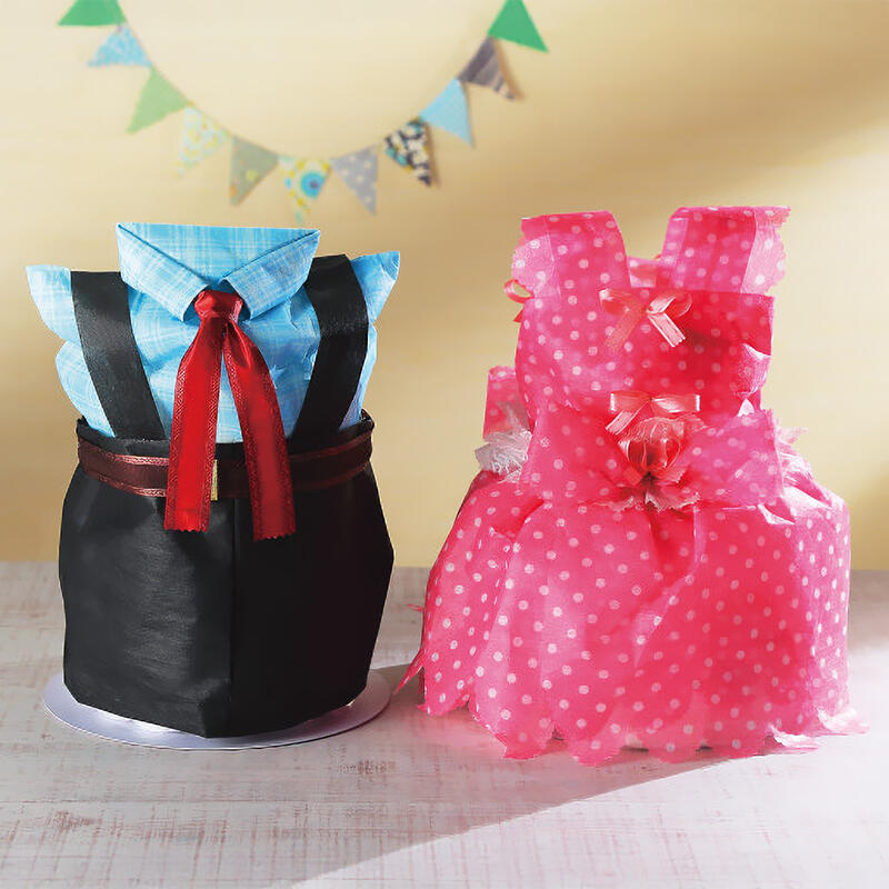シャツとズボンの男の子タイプのおむつdeケーキです。高さが36cmとダイナミックで御祝ことにはサプライズ・インパクトあります。