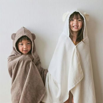 オーガニックコットン100%のやさしい心地のキュートな耳付きバスポンチョ。お風呂上りやおくるみなどにお使いいただけます。