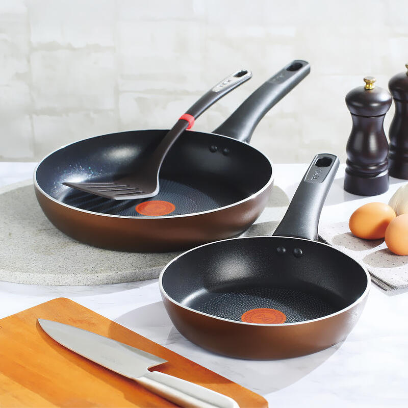 フライパン26cm=深さ約4.6cm、フライパン20cm=深さ約4.4cm、ターナー付●ガスコンロ可、100、200V電磁調理器対応