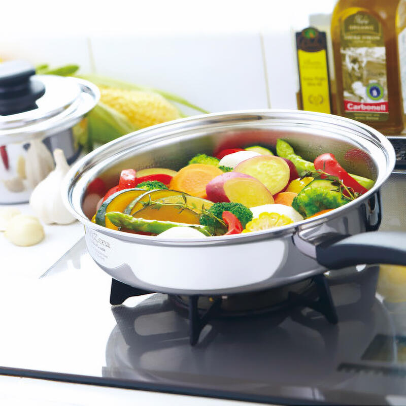 ステンレスとアルミニウムの全面5層構造で「熱しやすく、冷めにくい」理想的な熱効率を実現。小さな火力でも均一に熱を伝えることができ、短時間調理や余熱調理ができるので、省エネにも。素材の水分や少量の水で調理する無水調理で、野菜の栄養を逃さず、色鮮やかに仕上がり、素材の味を楽しめます。素材の脂分で調理する無油調理、炊飯、オーブン調理などマルチに活躍します。