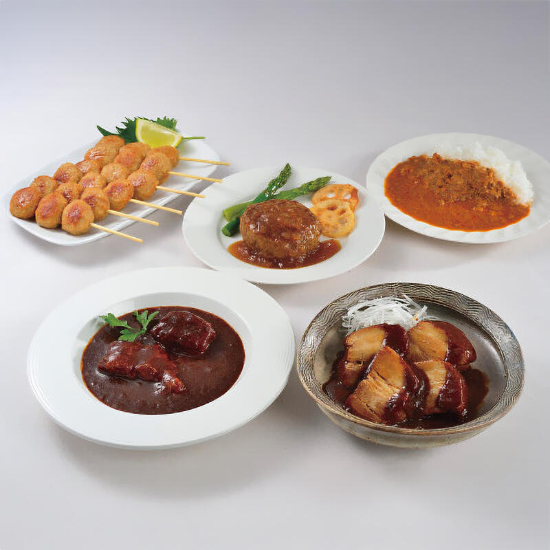 ハンバーグ(牛肉・豚肉使用)130g×2、和風シャリアピンソース40g×2、赤ワイン&地ビール仕込みのビーフシチュー170g×2、つくね串(6本)210g×1、六穀豚使用お肉屋さんのキーマカリー150g×2、豚肉の味噌煮込み210g×1