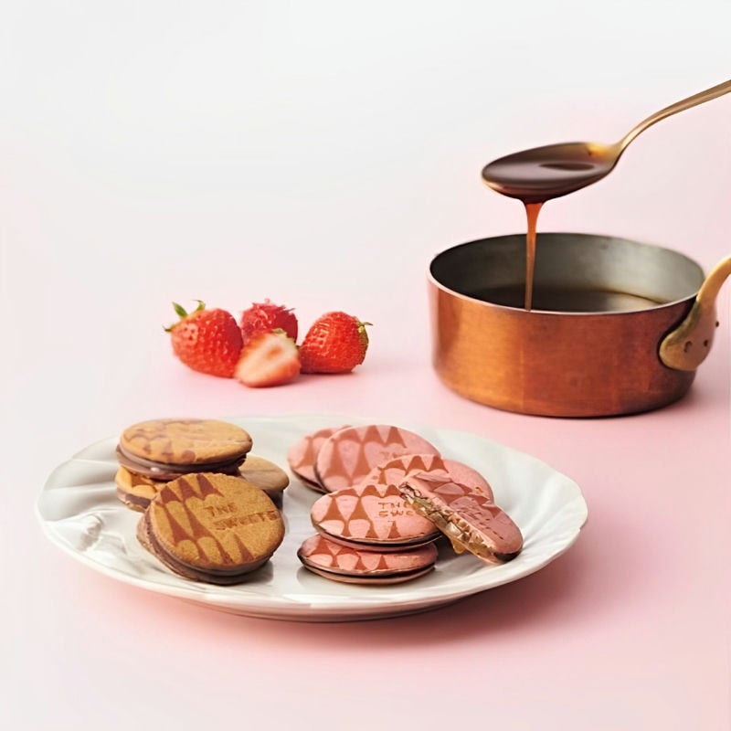 あまおう苺のフリーズドライを混ぜた濃厚なラングドシャ生地でキャラメルとチョコレートをサンドした苺キャラメルサンドとオリジナルフレーバーをセットにしました。