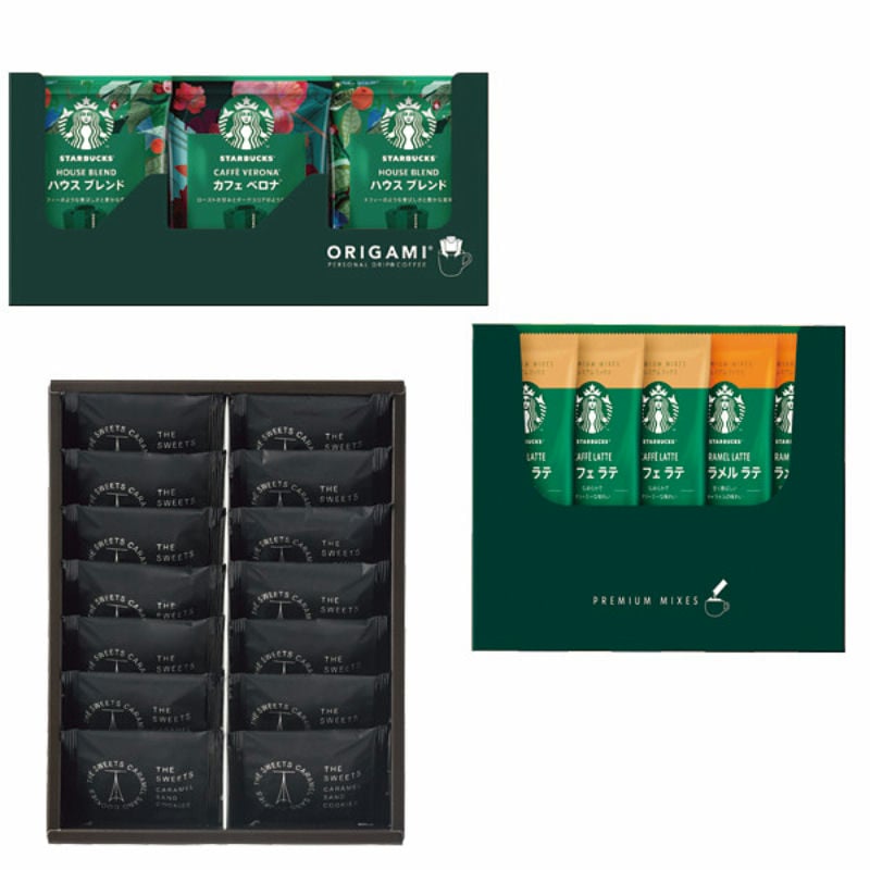 キャラメルサンド×14、スターバックスオリガミパーソナルドリップコーヒー(ハウスブレンド9g×3・カフェベロナ9g×2)、スターバックスプレミアムミックス(カフェラテ18g×3、キャラメルラテ23g×2)(スティック)※キャラメルサンドは溶けやすい商品のため、気温により販売時期が前後する可能性があります。
