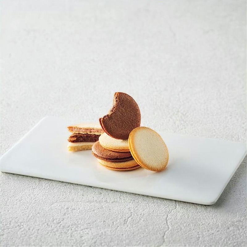 サクサク食感のプレーン生地とココア生地で、ホワイトチョコ、ミルクチョコ、ストロベリーチョコをサンドした3種類のラングドシャの詰め合わせ。