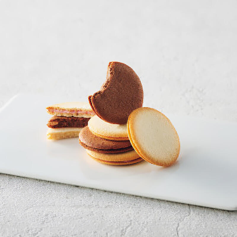 サクサク食感のプレーン生地とココア生地で、ホワイトチョコ、ミルクチョコ、ストロベリーチョコをサンドした3種類のラングドシャの詰め合わせ。