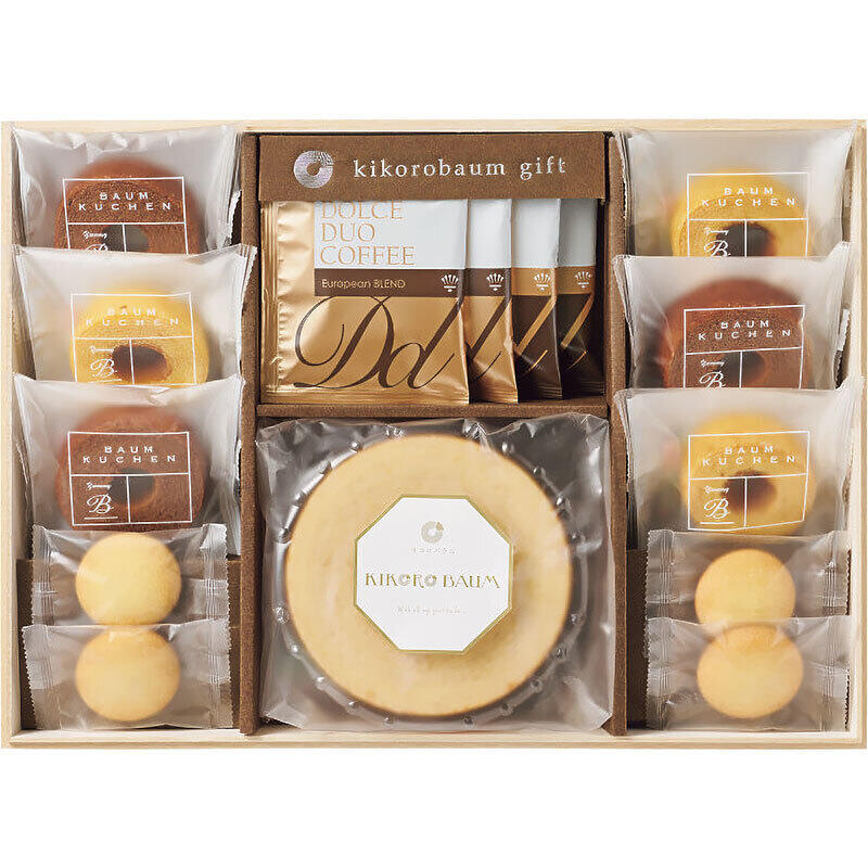 バウムクーヘン(北海道産生乳100%の生クリーム使用)(約13φcm)×1、ミニバウム(チョコ・バニラ)×各3、チョコインクッキー×4、ドリップコーヒー×4