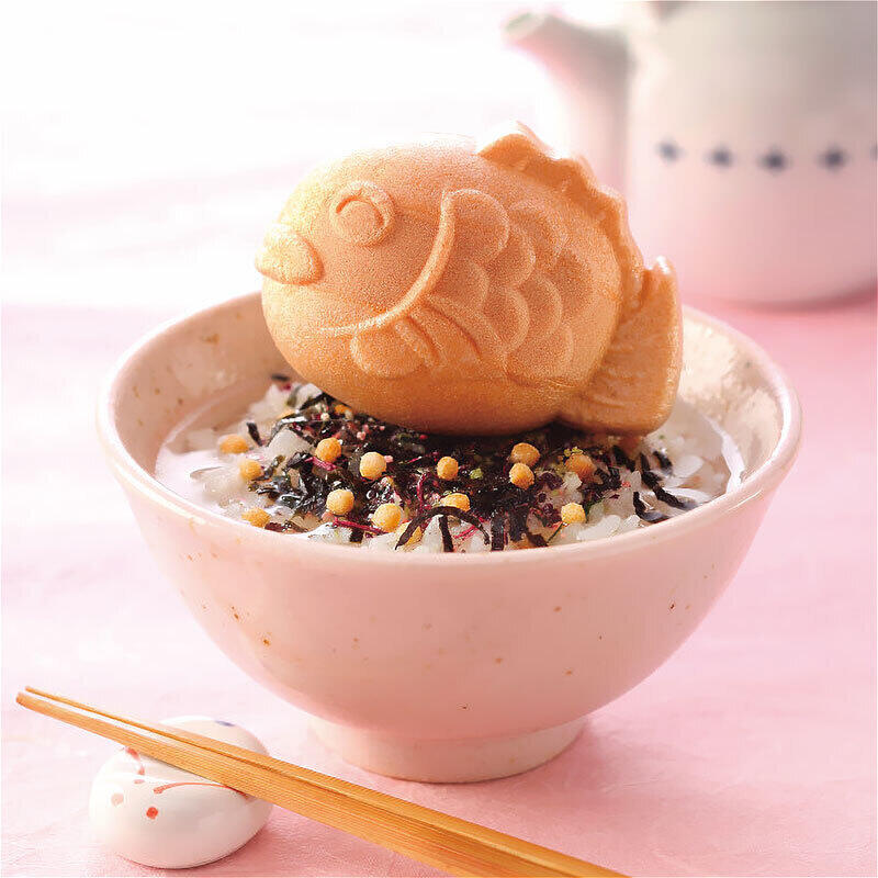 ふっくら可愛い鯛型もなかで3種類のお茶漬けを包みました。もなかの皮はモチモチ食感で食べ応え抜群です。