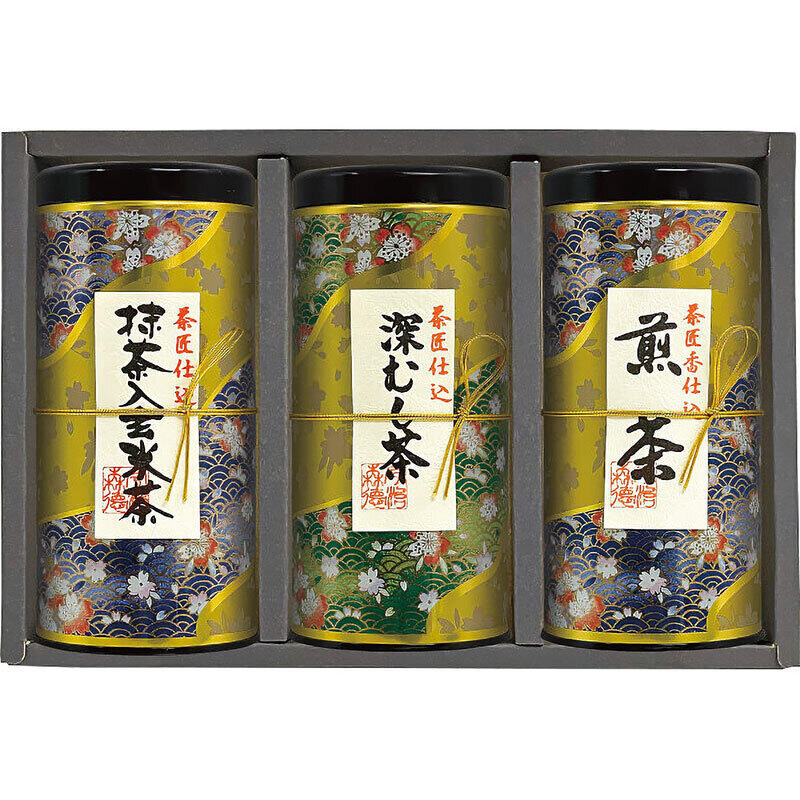 煎茶・深むし茶・抹茶入り玄米茶の詰め合わせです。香りを際立たせる製法で作られた程よい渋みの煎茶、濃い緑色とまろやかな味わいが特徴の深むし茶、香ばしい玄米の香りと抹茶の豊かでまろやかな旨味が特徴の抹茶入玄米茶を楽しめます。幅広い贈り物に最適な逸品です。
