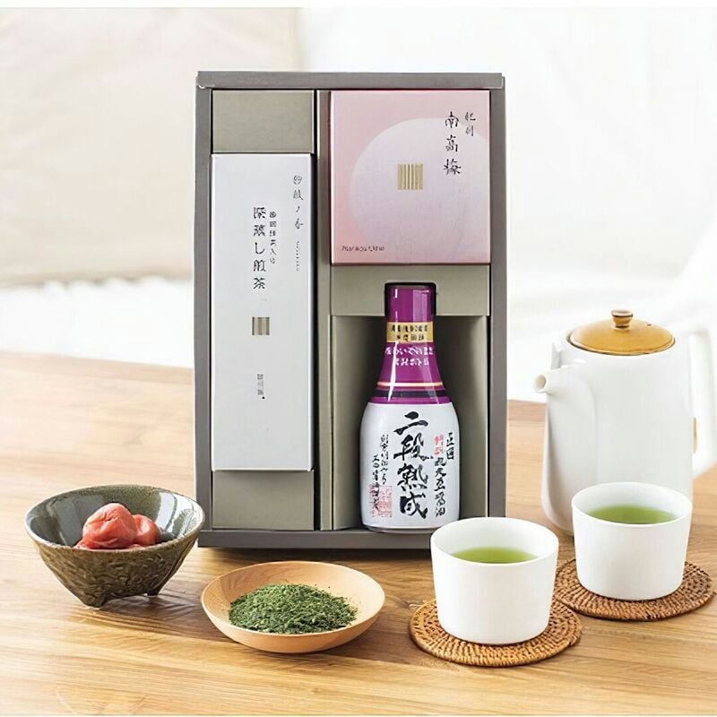 深蒸し煎茶 静岡抹茶入り65g、紀州南高梅70g、正田 特撰丸大豆醤油二段熟成200ml