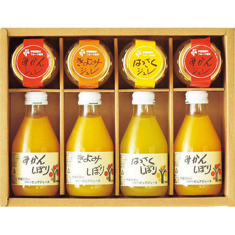 100%ピュアジュース(みかん180ml)×2・(きよみ・はっさく各180ml)×各1・ピュアフルーツ寒天ジュレ(みかん90g)×2・(きよみ・はっさく各90g)×各1