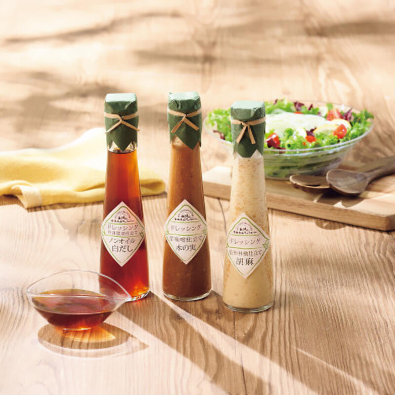 ドレッシング(信州林檎仕立て胡麻・甘味噌仕立て木の実)各120ml×各1、ドレッシングタイプ調味料(特選醤油仕立てノンオイル白だし)120ml×1