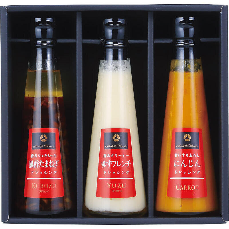 にんじんドレッシング・黒酢たまねぎドレッシング各160ml×各1、ゆずフレンチドレッシング150ml×1
