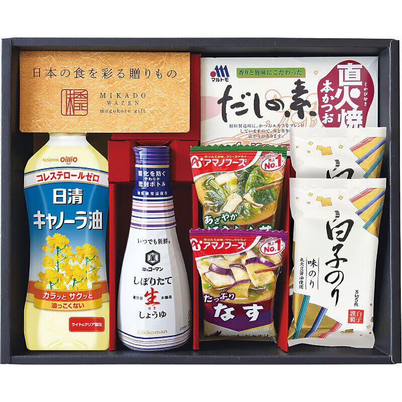 キッコーマンしぼりたて生しょうゆ200ml、アマノフーズフリーズドライいつものおみそ汁(なす・ほうれん草)×各1、白子のり(8切5枚)×2、マルトモ直火焼だしの素(4g×10)、日清キャノーラ油350g