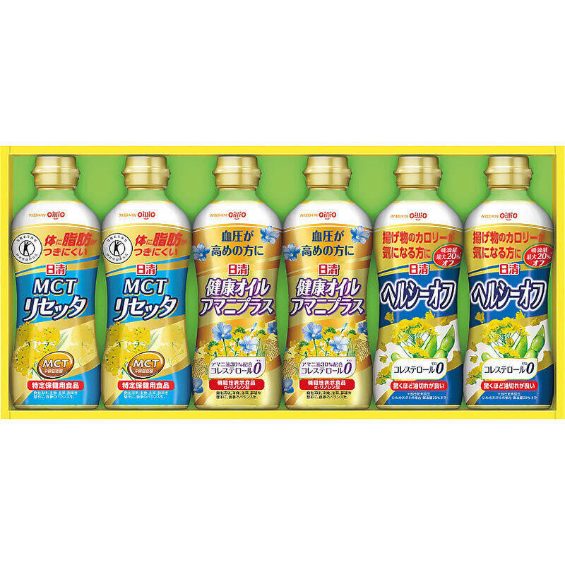 日清MCTリセッタ350g×2、日清健康オイルアマニプラス350g×2(機能性表示食品:届出番号A82、届出表示:本品は、αーリノレン酸を含んでおり、血圧が高めの方に適した機能を持つ食用油です。)、日清ヘルシーオフ350g×2