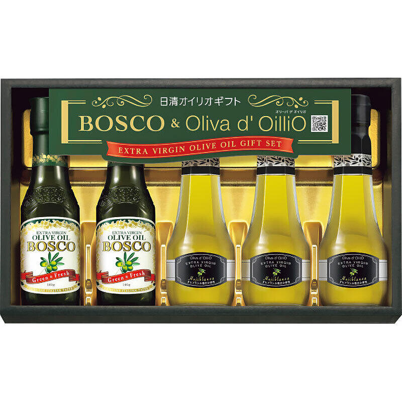 おなじみのボスコエキストラバージンオリーブオイルとギフト限定オリーバデオイリオエキストラバージンオリーブオイルオヒブランカの詰め合わせギフト。