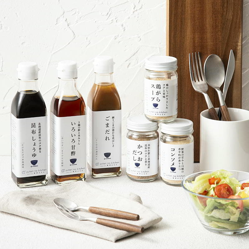 「ごまだれ」「昆布しょうゆ」「いろいろ甘酢」の調味料3点に、顆粒だし「コンソメ」「鶏がらスープ」「かつおだし」をプラスした6点セット。ごま和え、煮もの、照り焼き、酢豚、ピクルス、マリネなど、幅広い料理に活躍します。