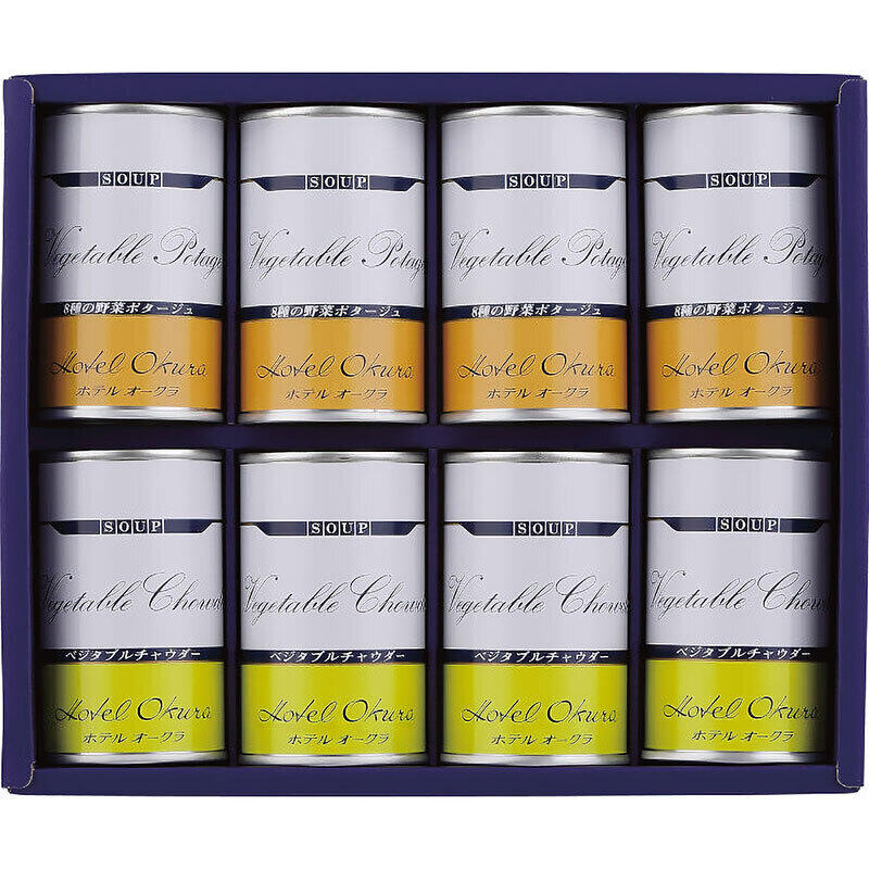 ホテルオークラのスープ缶詰2種の詰め合わせ。