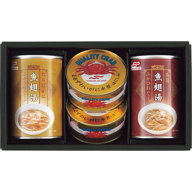 五目ふかひれのスープ缶290g×1、たらばがにとふかひれのスープ缶290g×1、まるずわいがにほぐしみ65g×2