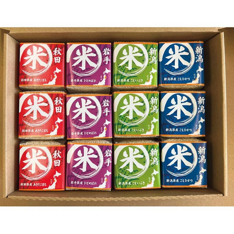 新潟県産コシヒカリ300g(2合)×3、新潟県産こしいぶき300g(2合)×3、秋田県産あきたこまち300g(2合)×3、岩手県産ひとめぼれ300g(2合)×3
