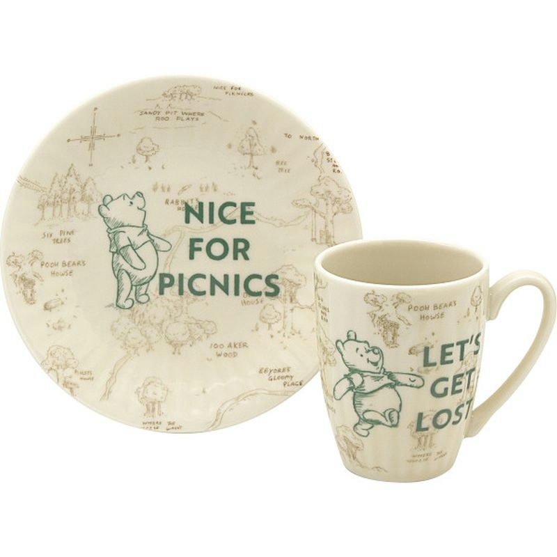 美しい100エーカーの森の地図を背景に、プーさんの暮らしがシンプルに描かれた軽量テーブルウェア。形状にはリズミカルなレリーフが付いたすっきりモダンな印象がもてそう。