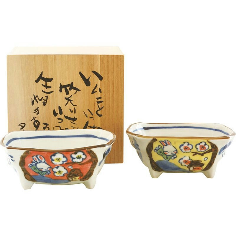 特徴的な角鉢に可愛らしいうさぎをあいらいました。木箱入りなのでギフトに最適です。