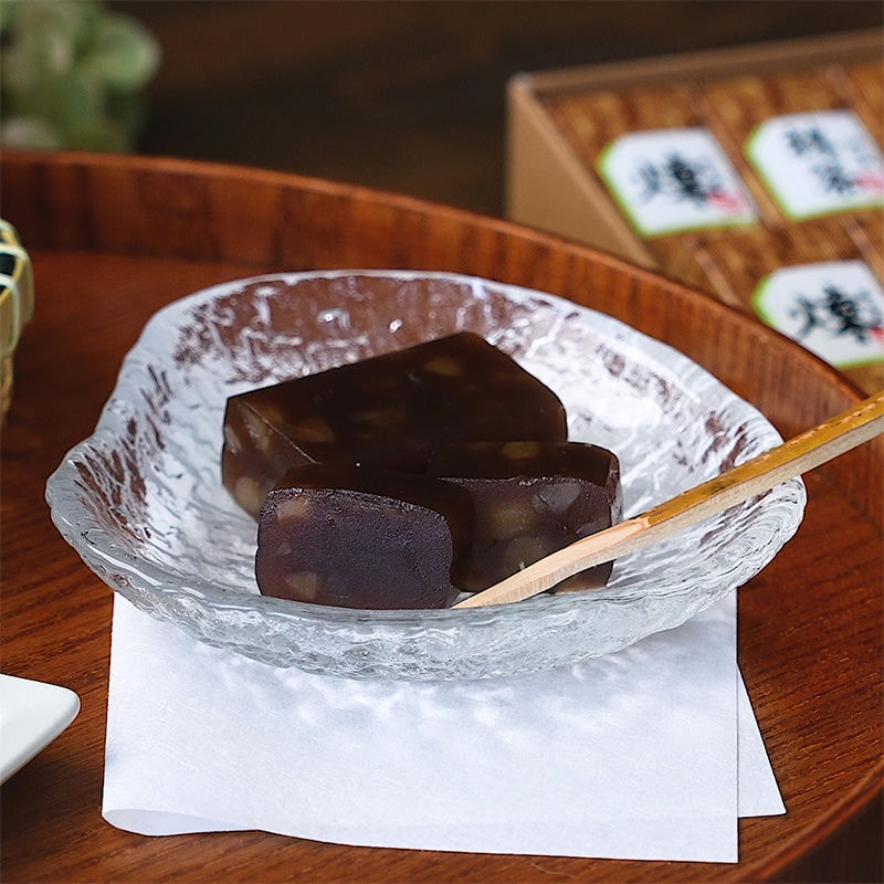 煉羊羹に、ふっくらと煮上げた小豆を練り込みました。小豆の豊かな風味が楽しめます。